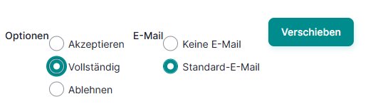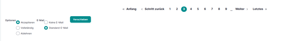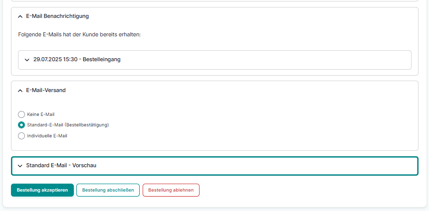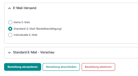 Um die Bestellung anzunehmen, markieren Sie bitte die entsprechende Bestellung, indem Sie diese vorne anhaken. Nun können Sie bei der Auswahl unten „Akzeptieren“ auswählen und entscheiden, ob der Endkunde keine E-Mail erhalten soll oder eine Standard E-Mail welche Sie festlegen können. Näheres hierzu unter Einstellungen E-Mail.
