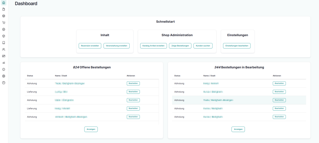 Im Bereich Bestellungen haben Sie die Möglichkeit, eingegangene Bestellungen zu bearbeiten. Eine Übersicht zu den Bestellungen aus Ihrem Online-Shop erhalten Sie zum einen, wenn Sie in der Menüleiste auf Dashboard klicken. Hier sehen Sie die offenen Bestellungen und die Bestellungen, welche in Bearbeitung sind. Mit Klick auf
