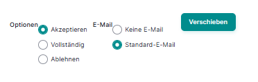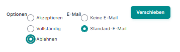Um die Bestellung abzulehnen, markieren Sie bitte die entsprechende Bestellung, indem Sie diese vorne anhaken. Nun können Sie bei der Auswahl unten „Ablehnen“ auswählen und entscheiden, ob der Endkunde keine E-Mail erhalten soll oder eine Standard E-Mail welche Sie festlegen können. Näheres hierzu unter Einstellungen E-Mail.