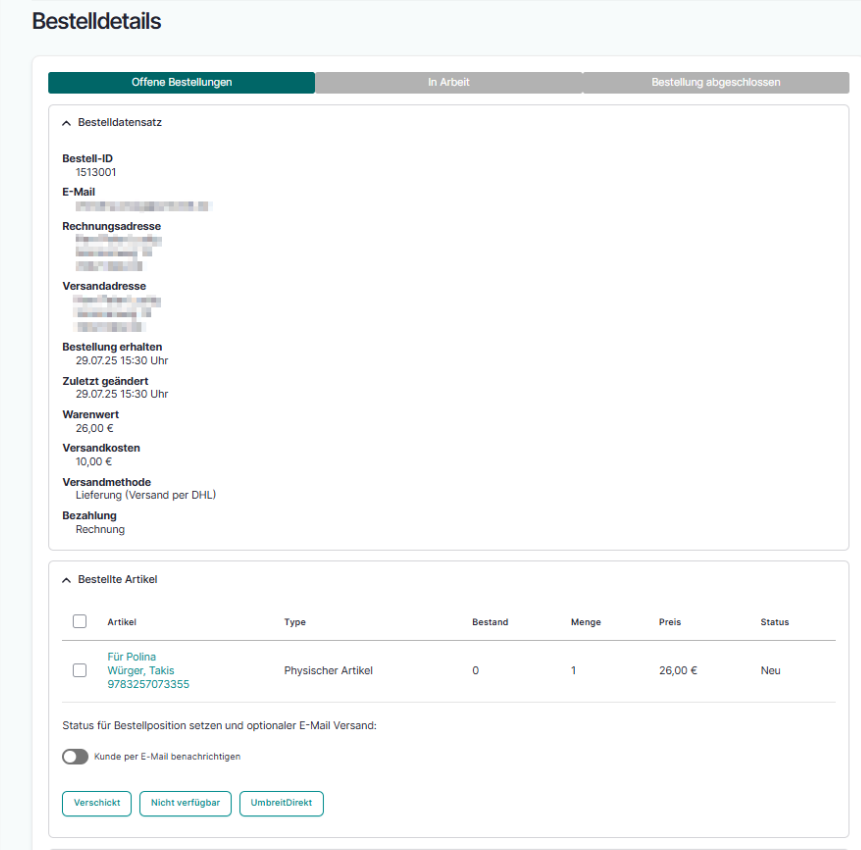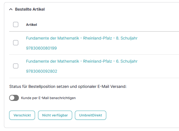 Sie können für jede einzelne Position den Status individuell ändern in Abholbereit/Verschickt, Nicht verfügbar oder UmbreitDirekt (optional).
