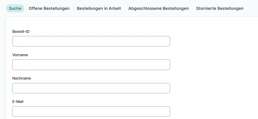 Über Suche können Sie gezielt nach einer Bestellung suchen. Bei Offene Bestellungen finden Sie neue, noch nicht bearbeitete Bestellungen, bei Bestellungen in Arbeit die bereits in Bearbeitung befindlichen Bestellungen, bei Abgeschlossene Bestellungen die fertigen Bestellungen und bei Stornierte Bestellungen sind die abgelehnten Bestellungen.