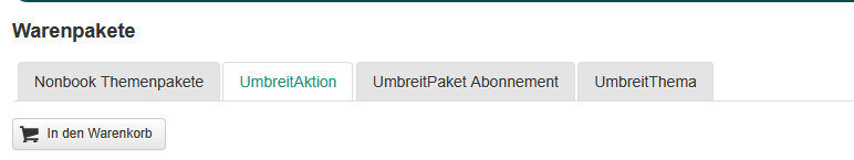 In diesem Bereich finden Sie die aktuell von Umbreit angebotenen Warenpakete zu unterschiedlichen Themen. Diese sind in Nonbook Themenpakete, UmbreitAktion, UmbreitPaket Abonnement und UmbreitThema untergliedert.