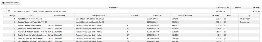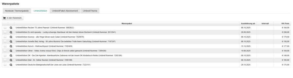 Durch Auswahl einer Warenpaketart werden die dazugehörigen Pakete angezeigt. Hier sehen Sie die Bezeichnung, das Datum der Auslieferung, das Intervall (bei UmbreitPaket Abonnement) sowie den VK-Preis des Paketes.