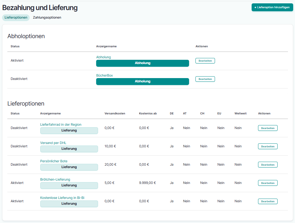In der Übersicht der Lieferoptionen sehen Sie alle Abholoptionen bzw. Versandoptionen, die Sie angelegt haben. Bearbeiten können Sie die einzelnen Optionen indem Sie rechts auf