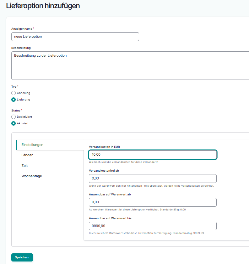 Haben Sie als Typ Lieferung ausgewählt, öffnen sich weitere Einstellungen: In dem Feld Versandkosten in EUR tragen Sie den Betrag der Versandkosten ein, wenn es keine Versandkosten gibt, dann tragen Sie bitte 0,00 ein. Wenn Versandkosten eingetragen sind, können Sie bei Versandkostenfrei ab einen Betrag festlegen, ab dem keine Versandkosten berechnet werden sollen. Im Feld Anwendbar auf Warenwert ab können Sie einstellen ab welchem Betrag die Lieferoption auswählbar ist, ebenso kann bei Anwendbar auf Warenwert bis ein Betrag festgelegt werden bis zu welchem Wert die Lieferoption auswählbar ist. Unter Länder kann das Liefergebiet festgelegt werden.
