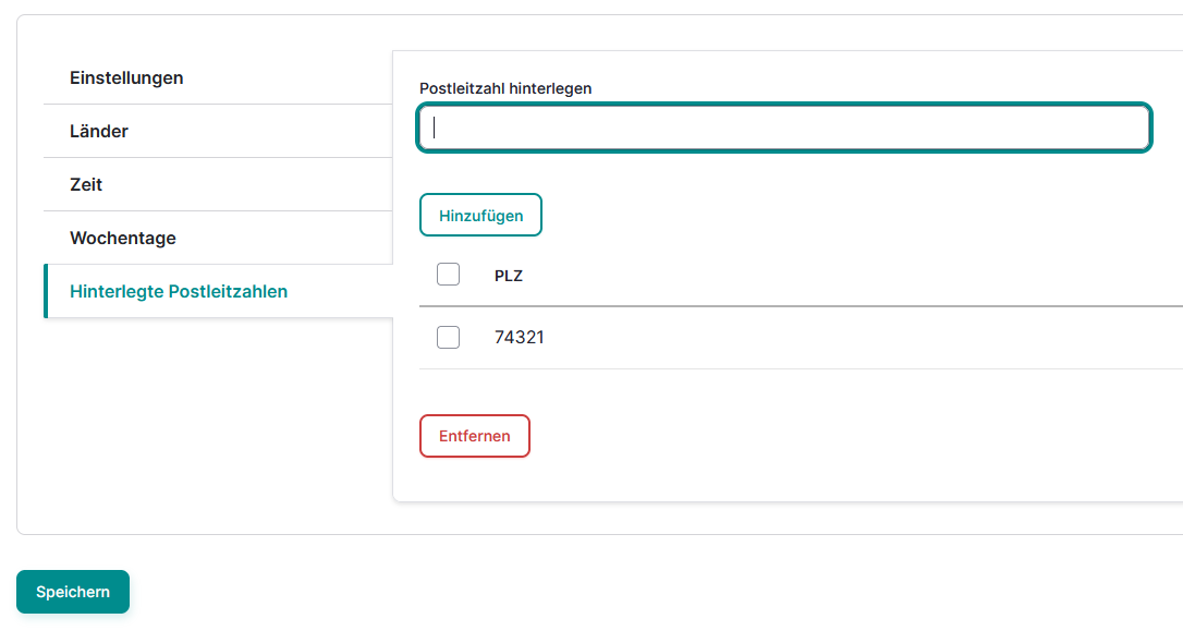 Sie können nun auf den Reiter „Hinterlegte Postleitzahlen“ klicken. Die Lieferoption greift nur für die Postleitzahlen, welche Sie hier hinterlegen.