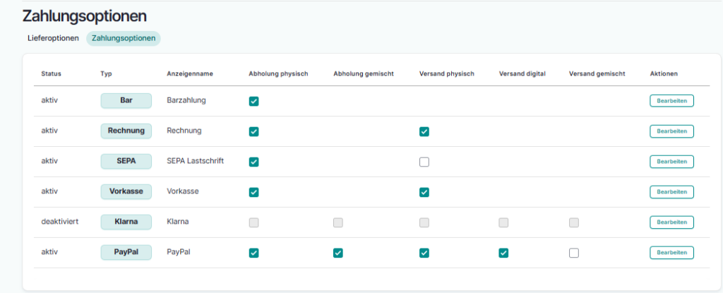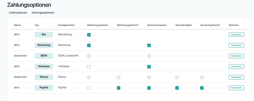 Unter Zahlungsoptionen sehen Sie alle Zahlungsoptionen, die Sie für Ihren Shop verwenden können. Sie können jeweils entscheiden, ob Sie diese anbieten, also aktivieren wollen und für welche Artikel Sie das anbieten möchten.