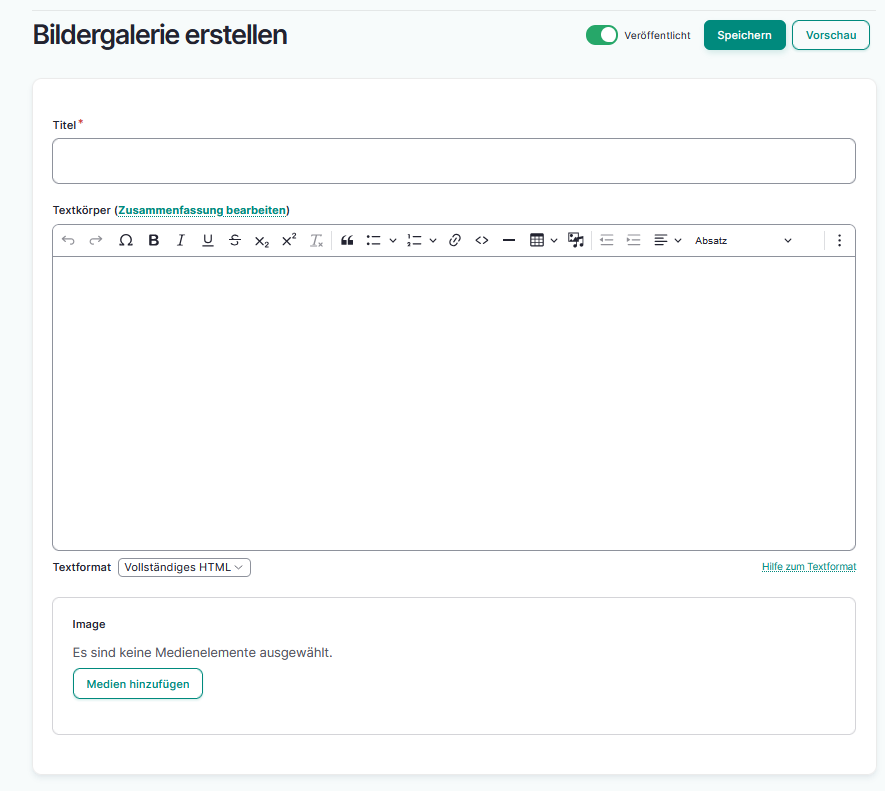 Geben Sie dieser Seite im Feld „Titel“ einen passenden Namen. Im Feld „Textkörper“ können Sie einen entsprechenden Text zu den Bildern hinterlegen und bei „Image“ können Sie von Ihrem PC die Bilder hochladen, die angezeigt werden sollen. Nach dem Klick auf