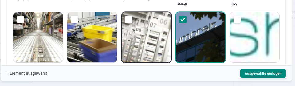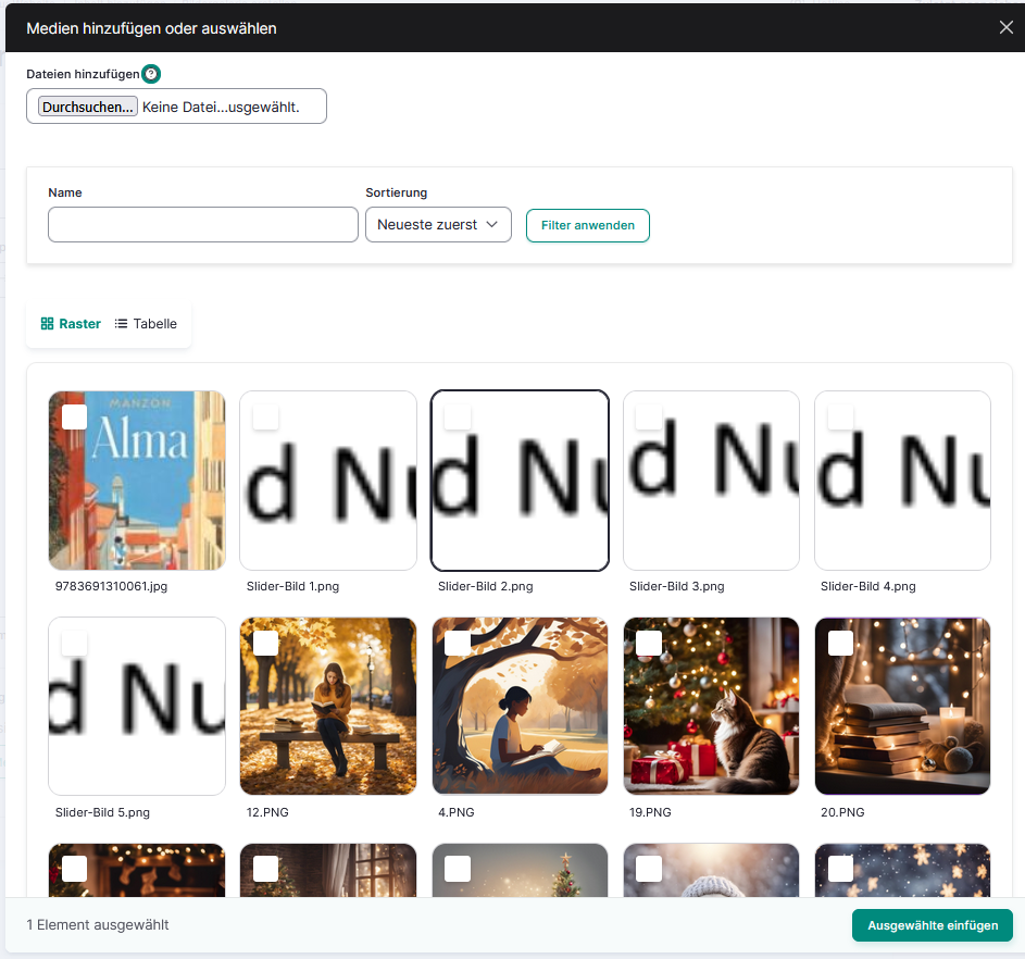 Unten in der Maske werden die bereits in der Medienbibliothek gespeicherten Bilder und Dateien aufgelistet. Setzen Sie einen Haken in das Kästchen des ausgewählten Bildes und über den Button