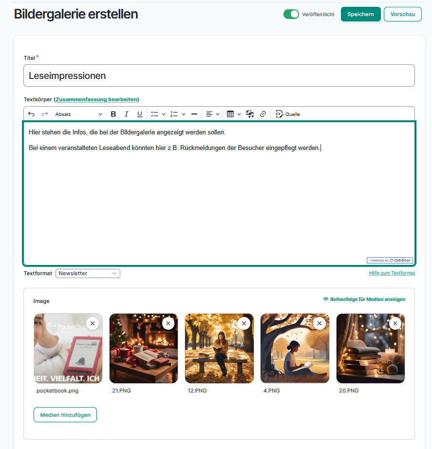 Mit diesem Element können Sie mehrere Bilder auf einer Seite anzeigen lassen. Zum Beispiel „Eindrücke aus der Buchhandlung“.