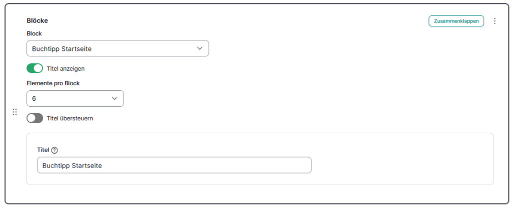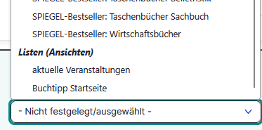 Wählen Sie z. B. „Buchtipp Startseite“ aus, öffnet sich eine Maske in der die definierte Menge an Buchtipps als Kacheln auf der Startseite festgelegt wird.