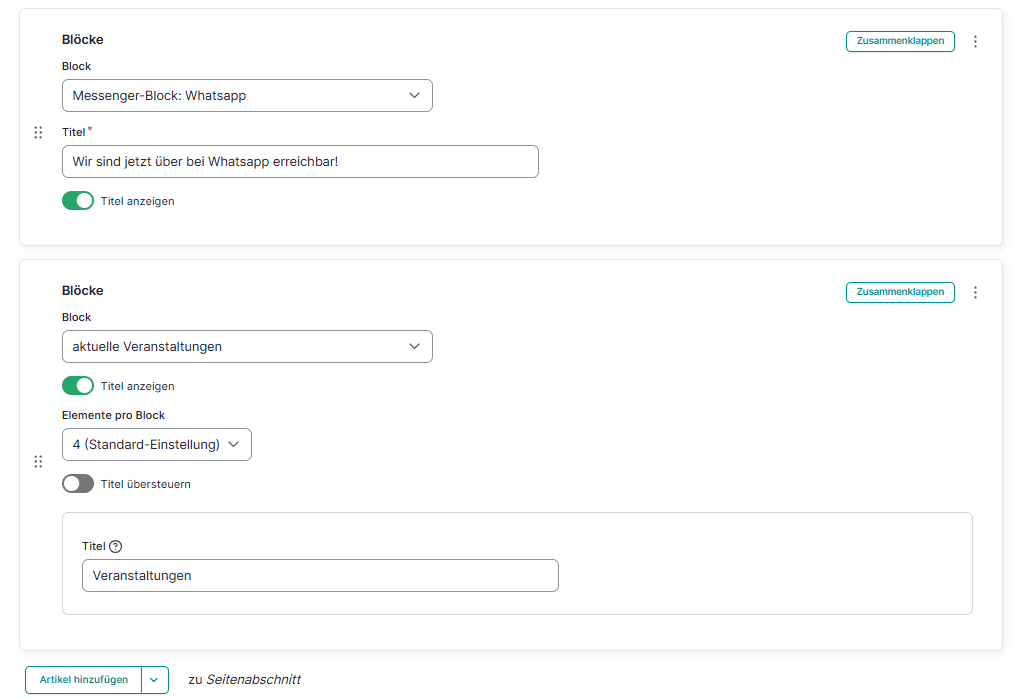 Um auf der Startseite einen neuen Block hinzuzufügen, gehen Sie auf Startseite bearbeiten und wählen unten über den Drop-Down einen neuen Block aus.
