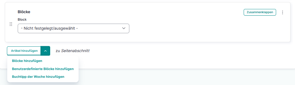 Hier kann aus einer Liste festgelegter Blöcke ausgewählt werden welchen Block Sie einfügen möchten.