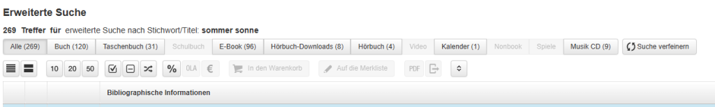 Über die Buttons des ersten (oberen) Navigationsbereichs können Sie die tabellarische Trefferliste auf die einzelnen Produktgruppen einschränken. In Klammer hinter der jeweiligen Produktgruppe sehen Sie die Anzahl der gefundenen Artikel. Sollte es zu einer Produktgruppe keine Treffer geben, ist der entsprechende Button deaktiviert (ausgegraut). Durch Klick auf die Schaltfläche „Suche verfeinern“ gelangen Sie zurück in die zuvor ausgewählte Suchmaske. Ihre eingegebenen Suchparameter bleiben erhalten.