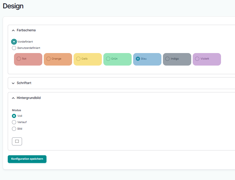 Hier können Sie Ihr Farbschema einstellen/anpassen. Sie können zwischen dem Modus Vordefiniert und Benutzerdefiniert wählen. Unter dem Punkt Vordefiniert können Sie aus den vorgegebenen Farben eine Farbe auswählen. Unter dem Punkt Benutzerdefiniert können Sie eine Hauptfarbe wählen. Aus Gründen der Barrierefreiheit wird die passende Akzentfarbe vom Shop selbst definiert. Durch die Auswahl der Farbe entscheiden Sie, in welcher Farbe Ihre Menüpunkte angezeigt werden.