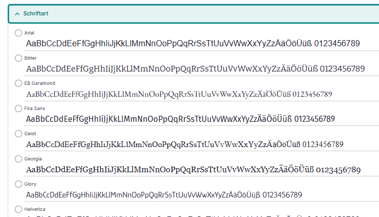 Hier können Sie aus den angezeigten 22 Schriftarten, Ihre gewünschte Schriftart auswählen.