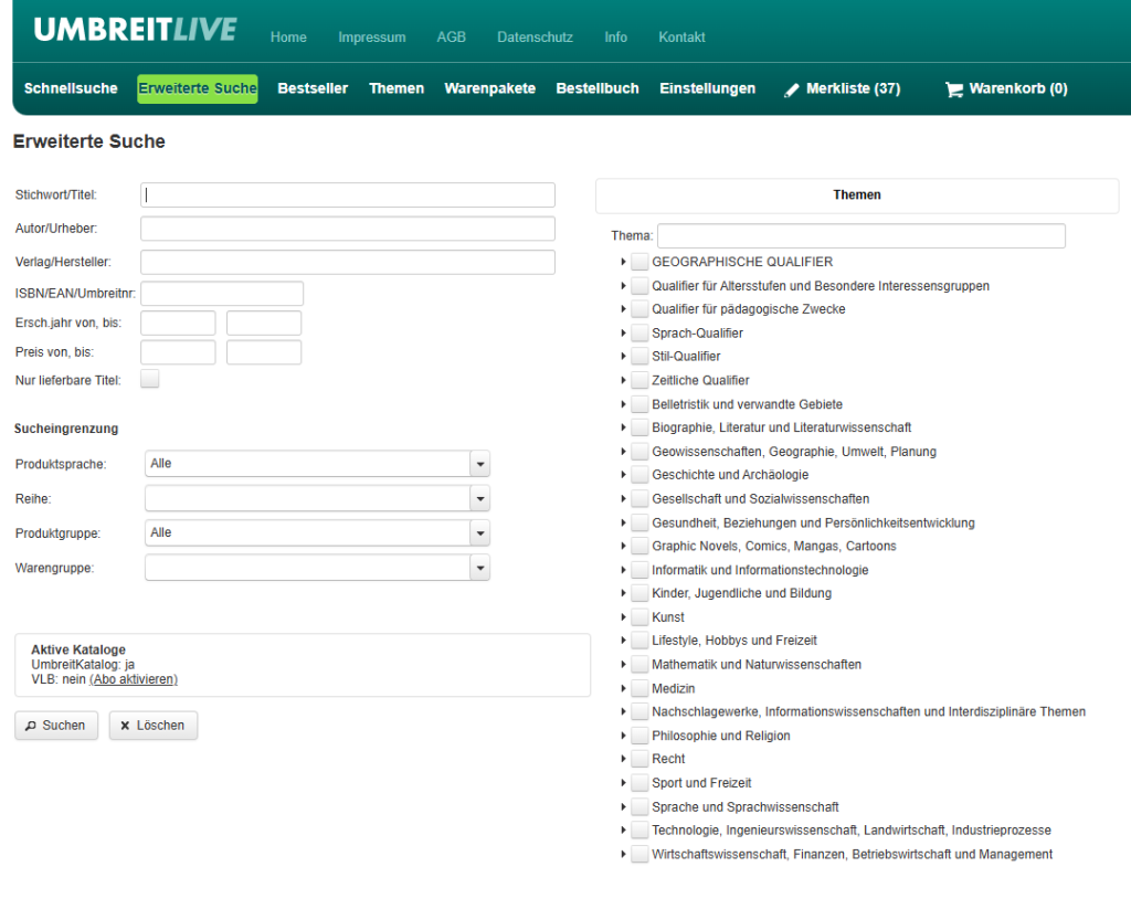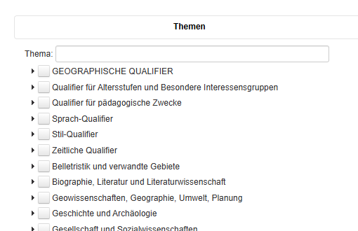Alternativ kann über die „Themen-Suche“ nach Interessensgebieten gefiltert werden. Diese neu aufgenommene Klassifikation erlaubt es Ihnen, über ein Suchfeld nach einem bestimmten Themengebiet zu suchen, oder über den Kategorien-Baum zugeordnete Titel zu finden.