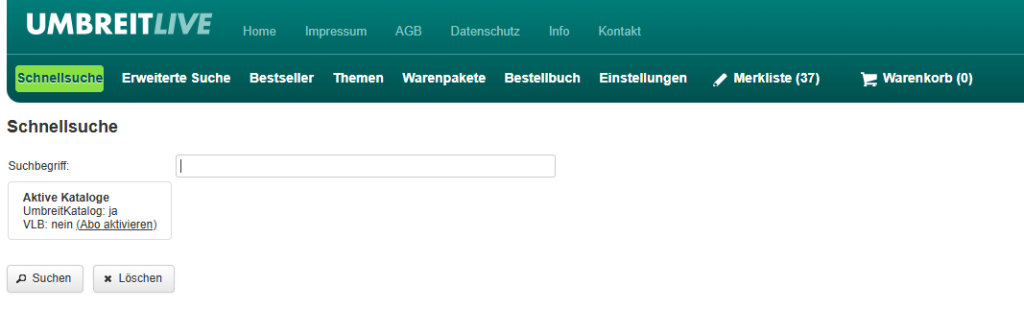 Die Schnellsuche ermöglicht die Suche in allen lieferbaren und vergriffenen Artikeln des Barsortiments Umbreit.