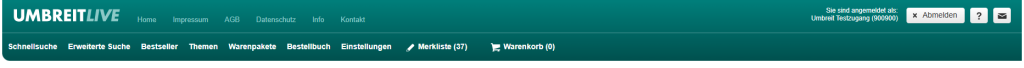 Nach dem erfolgreichen Einloggen gelangen Sie auf die Startseite der Anwendung. Gleichzeitig wird die Hauptnavigation eingeblendet und der angemeldete Benutzer mit Name und Kundennummer angezeigt. Auf der rechten Seite sind zusätzlich die Schaltflächen „Abmelden“, „Hilfe“ und „Nachricht an Umbreit“ sichtbar.