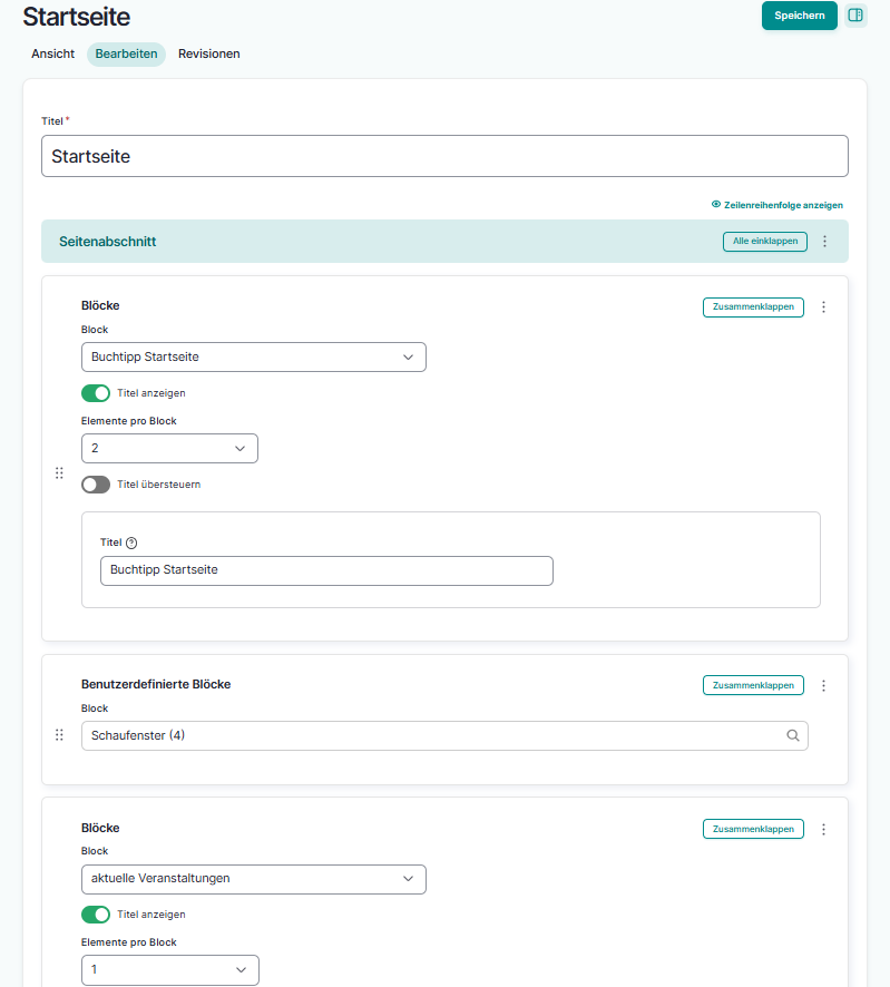 können Sie einen Artikel, verschiedene Blöcke, benutzerdefinierte Blöcke und Buchtipps hinzufügen. Weitere Infos zu den verschiedenen Elementen unter „Neuen Inhalt erstellen“ .