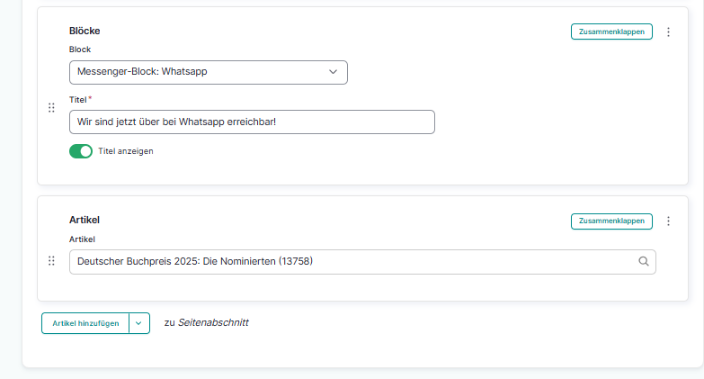 Hier können Sie die Inhalte der vorhandenen Elemente anpassen, die Reihenfolge der Elemente durch Bewegen verändern und links unten über den Button Artikel hinzufügen