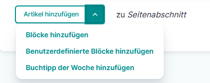 können Sie einen Artikel, verschiedene Blöcke, benutzerdefinierte Blöcke und Buchtipps hinzufügen. Weitere Infos zu den verschiedenen Elementen unter „Neuen Inhalt erstellen“ .