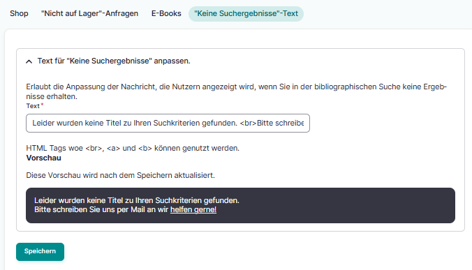 In diesem Bereich der Einstellungen können Sie den Text ändern, der erscheint, wenn mit den eingegebenen Suchbegriffen keine Treffer gefunden werden.