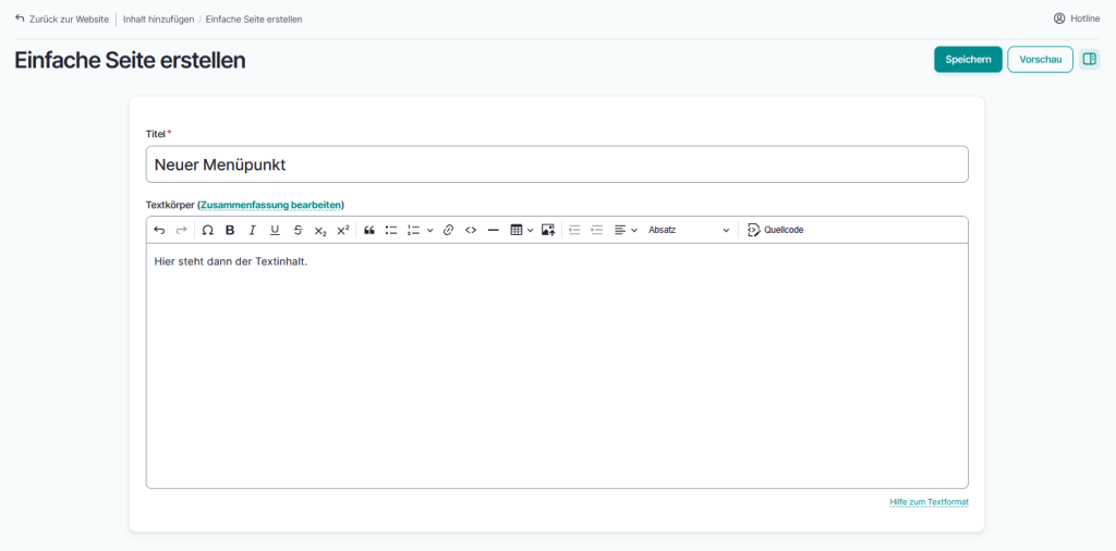 Je nach Wunsch wählen Sie für einen neuen Menüpunkt wie z.B. „Über uns“ eine Einfache Seite aus, für eine Bildergalerie zu einem Event den Inhalt Bildergalerie aus.