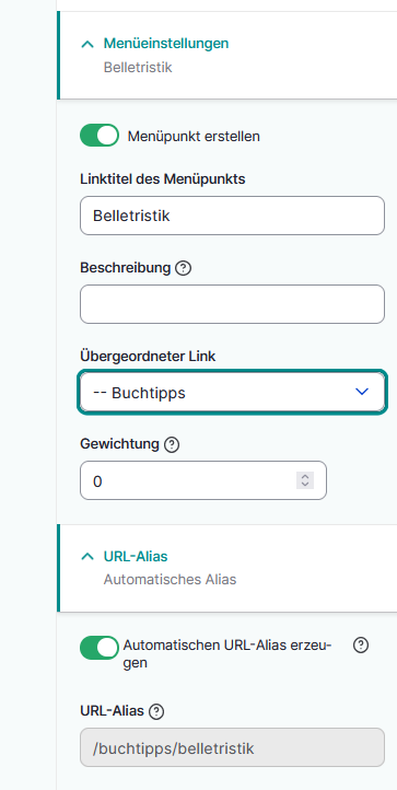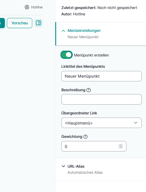Bei übergeordneter Link steht bereits <Hauptmenü> und dadurch wird der neue Punkt im Hauptmenü erstellt.