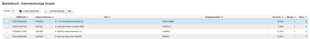 In „Kalenderbezüge Vorjahr“ erhalten Sie eine Liste aller im Vorjahr bezogenen Kalender. Durch Auswahl der entsprechenden Kundennummer oder „alle“