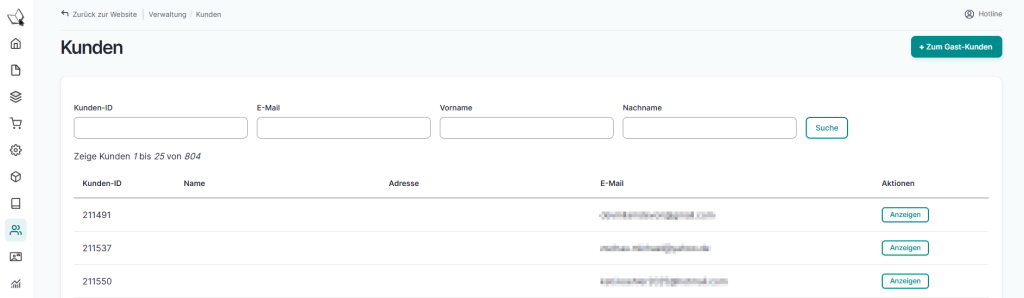 Es werden Ihnen 25 Einträge angezeigt. Unten können Sie über die Seitenzahlen Ihre Kundenliste durchblättern. Über die Suchfelder oben können Sie mit der Kunden-ID, Mailadresse und Vor- und Nachname auch gezielt nach einem Kunden suchen.