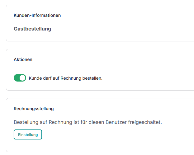 Gast-Kunden sind alle Kunden, die sich kein Kundenkonto anlegen und als Gast bestellen. Hier können Sie im folgenden Fenster bestimmen, ob Gast-Kunden per Rechnung bezahlen dürfen oder nicht. Auch hier sehen Sie die Bestellungen, die über das Gast-Konto bestellt wurden, in einer Liste.