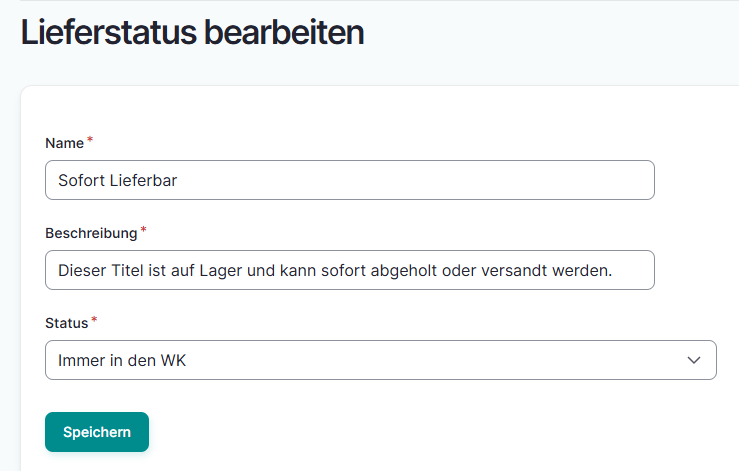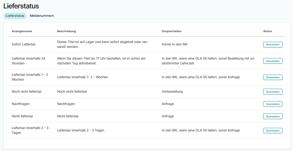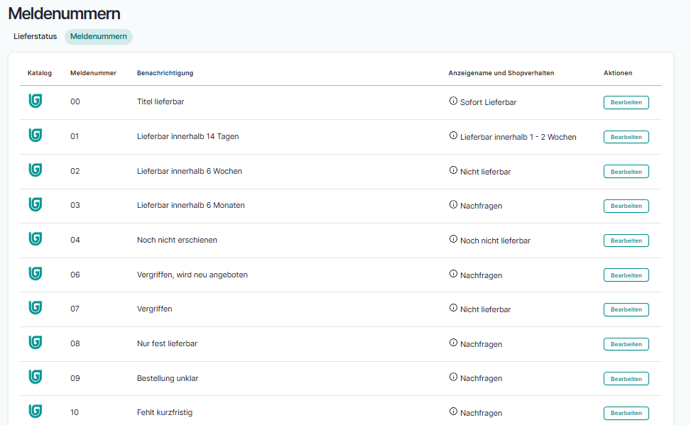 In diesem Bereich können Sie individuelle Einstellungen für die Lieferbarkeitsanzeige in Ihrer Shopsolution anhand der vom Barsortiment Umbreit gelieferten Meldenummern vornehmen. Das bedeutet, dass Sie entscheiden können, ob beispielsweise ein Titel mit Meldenummer 18 (Besorgungstitel) mit der Meldung „Nachfragen“ oder „Nicht lieferbar“ angezeigt werden soll.