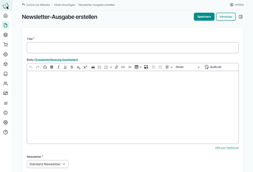 Hier vergeben Sie den Titel des Newsletters, füllen das Feld Body mit Text und Bildern und zum Schluss speichern Sie alles über den Button „Speichern“