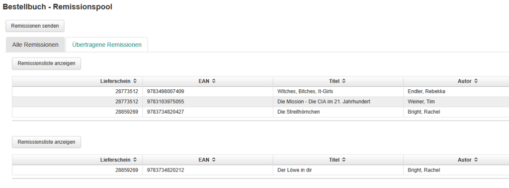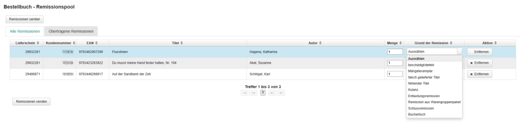 Sie finden den Remissionspool im Menü „Bestellbuch“ – „Remissionspool“.