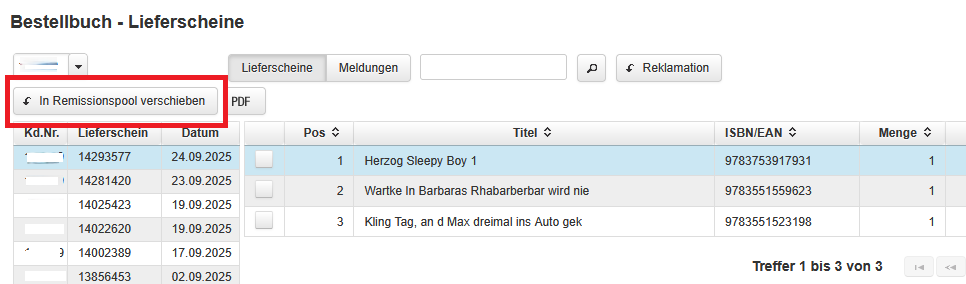 Beginnend im Menü „Bestellbuch“ – „Lieferscheine“ können Sie Artikel für die Remission auswählen und diese über den Button „In Remissionspool verschieben“ für die Remission auswählen.