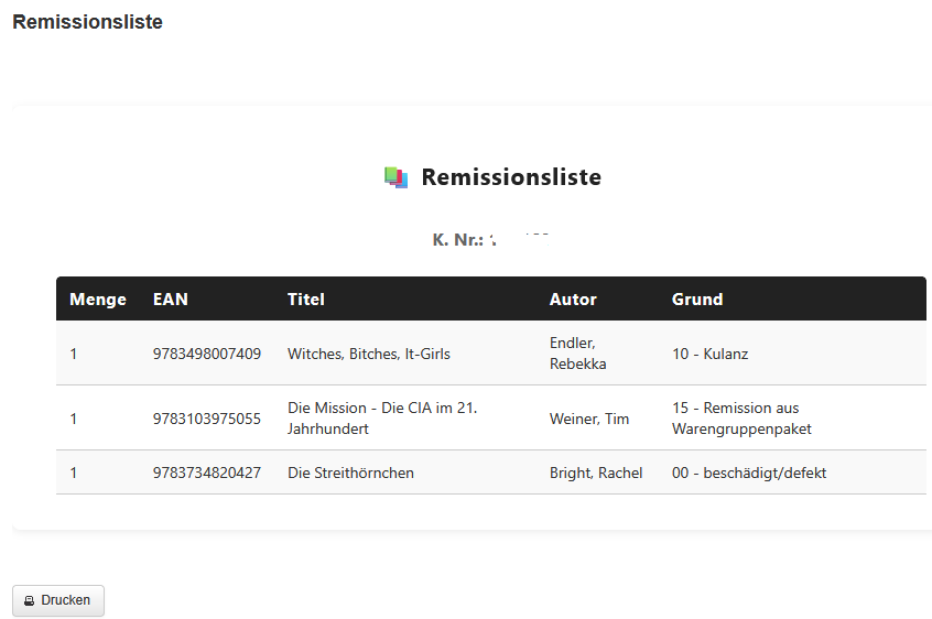 Hier können Sie über „Remissionsliste anzeigen“ den Remissionsbeleg ausdrucken und dem Packstück beilegen.