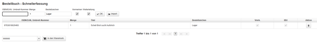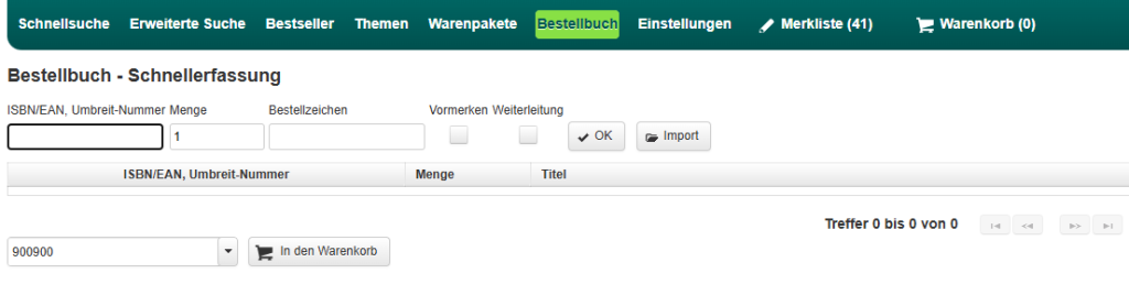 Über die Schnellerfassung können Sie durch Eingabe der ISBN/EAN oder Umbreit-Nummer, der Bestellmenge und eines optionalen Bestellzeichens schnell und einfach Artikel in den Warenkorb legen.