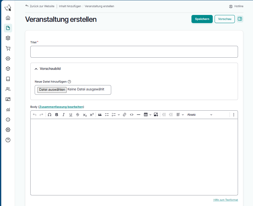 Eine Veranstaltung füllen Sie auch mit Titel, Infotext, eventuell ein oder mehrere Bilder und Titeln, die zur Veranstaltung passen.