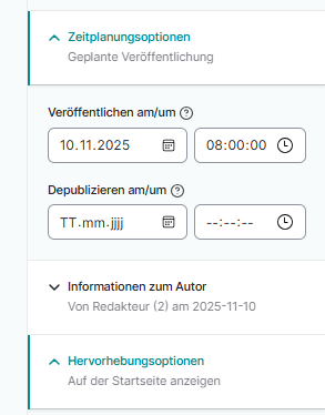 Auf der rechten Seite haben Sie die Möglichkeit über den Punkt „Zeitplanungsoptionen“ einzustellen, wann die Veranstaltung auf der Webseite online geht.