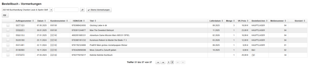 In der Übersicht der Vormerkungen finden Sie folgende Angaben: Auftragsnummer, Datum, Kundennummer, ISBN/EAN, Titel, Lieferdatum, Menge, VK-Preis, Bestellzeichen und Meldenummer. Unterhalb dieser Übersicht werden folgende Navigationspunkte angezeigt (von links nach rechts):