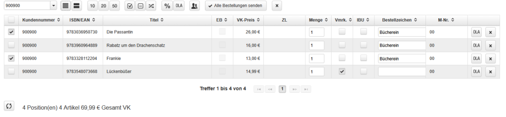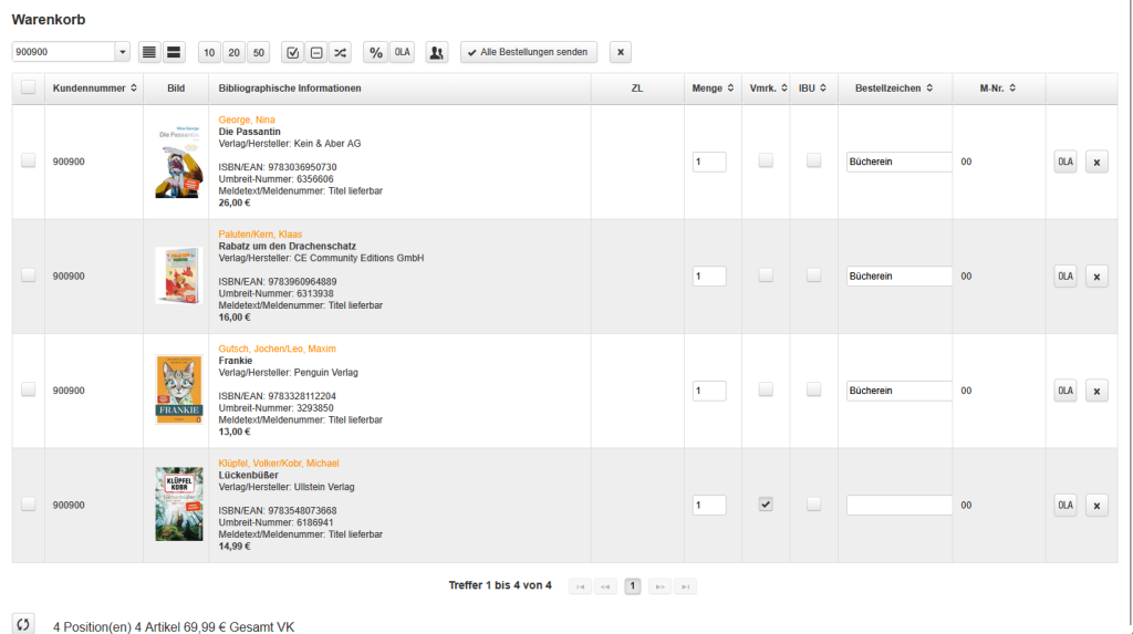 In der Warenkorb-Übersicht werden Ihnen folgende Informationen zu den Artikeln angezeigt: Kundennummer, ISBN/EAN, Titel, VK-Preis, Menge, Vormerken, Weiterleiten, Bestellzeichen, Meldenummer, OLA-Button, Position löschen.