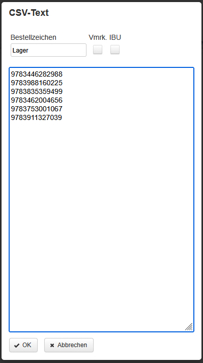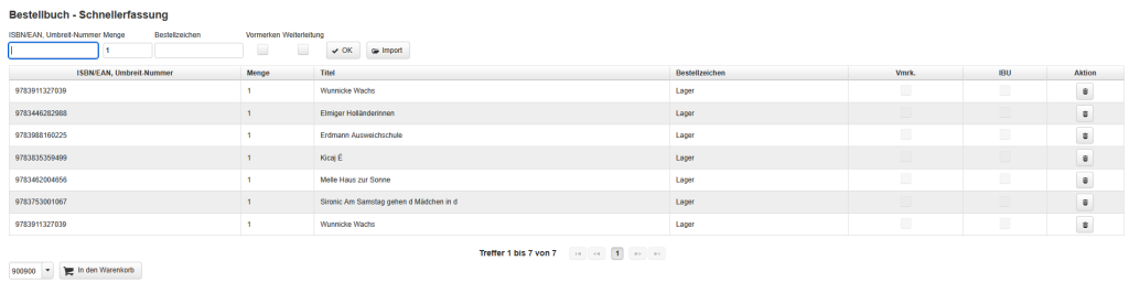 öffnet sich die Importfunktion. Hier können Sie durch die Eingabe mehrerer ISBN/EAN oder Umbreit-Nummern, der Bestellmenge und eines optionalen Bestellzeichens (jeweils mit Semikolon getrennt) schnell und einfach mehrere Artikel auf einmal in den Warenkorb legen. Darüber hinaus haben Sie die Möglichkeit, den Artikel vorzumerken oder als Verlagsbestellung zu speichern.